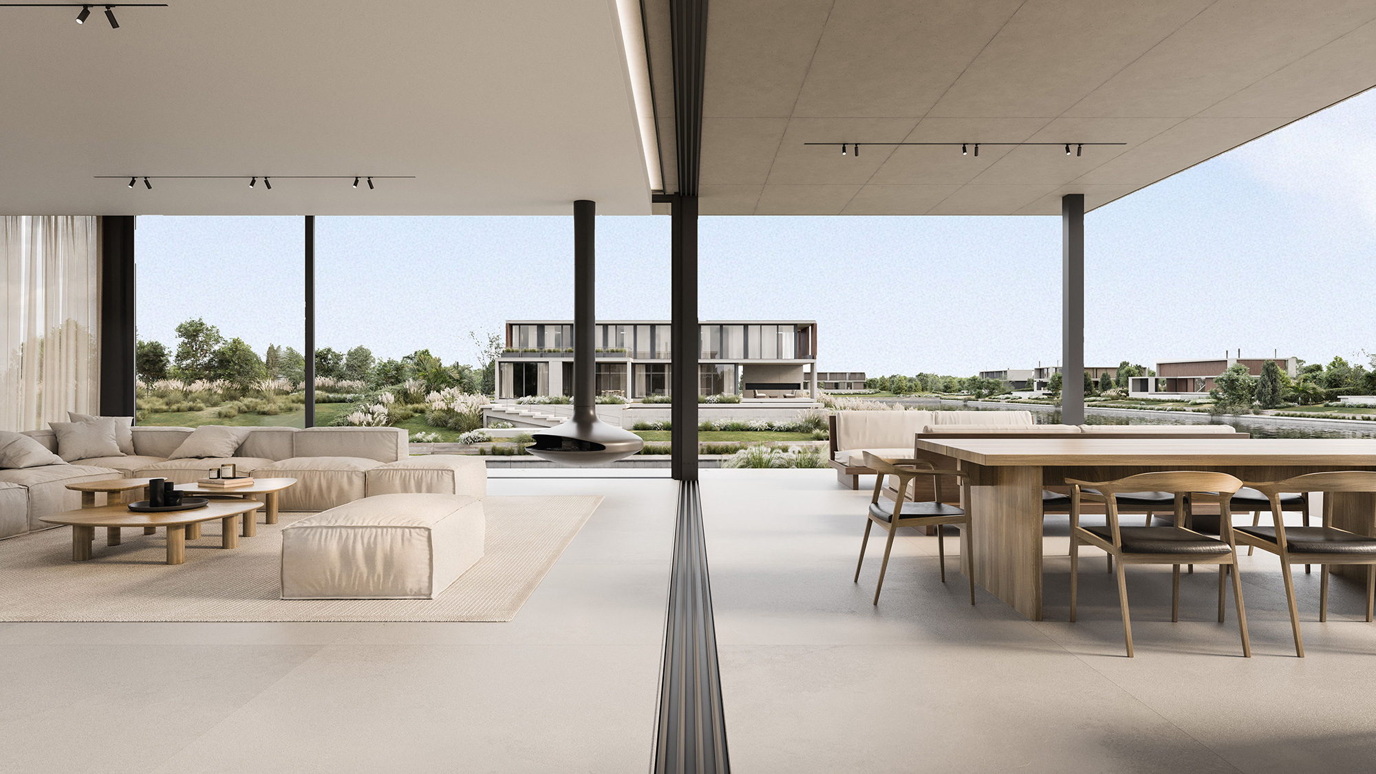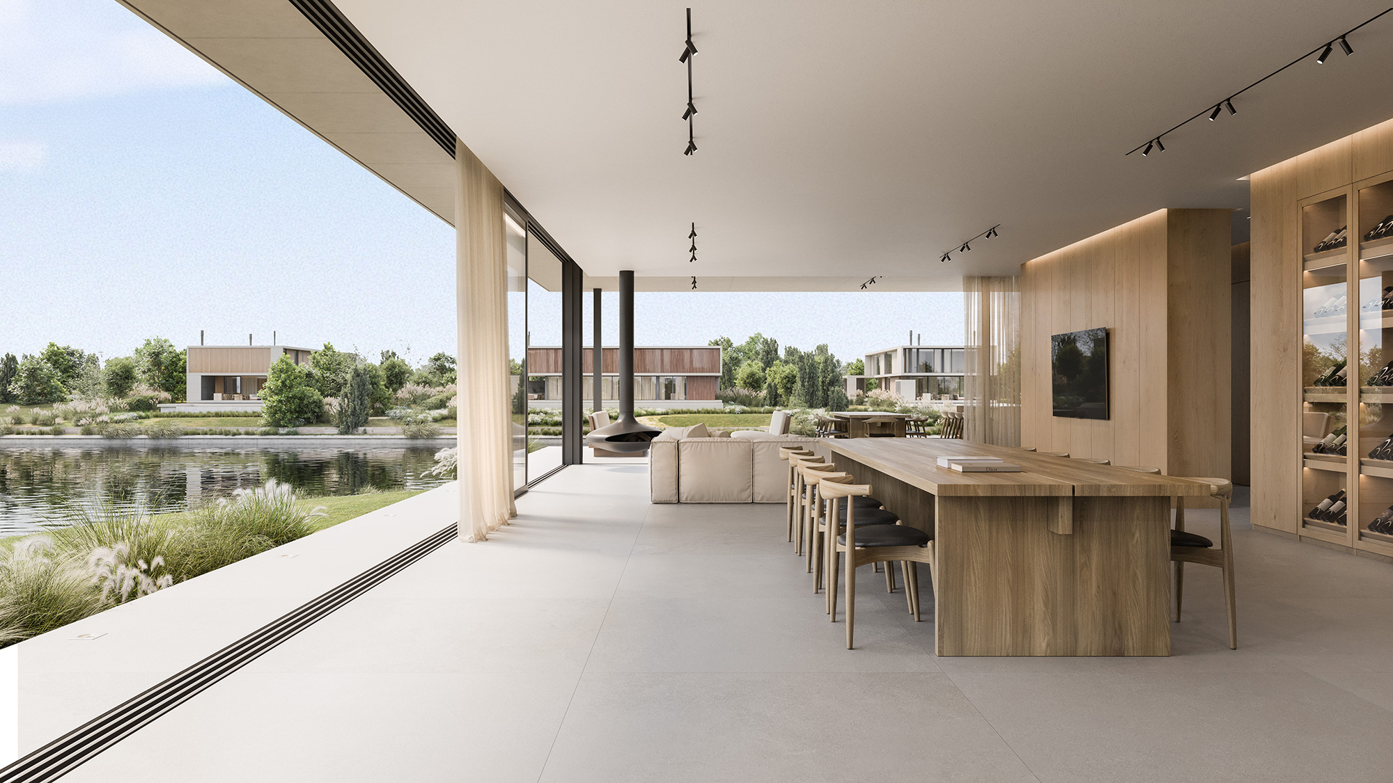 El living se ubica en una esquina de la casa, logrando una gran apertura y conectividad visual con el exterior, potenciando la relación entre el interior y el paisaje. La galería y la pileta están situadas a un costado, aprovechando la orientación del terreno para crear espacios de recreo y descanso vinculados al canal.