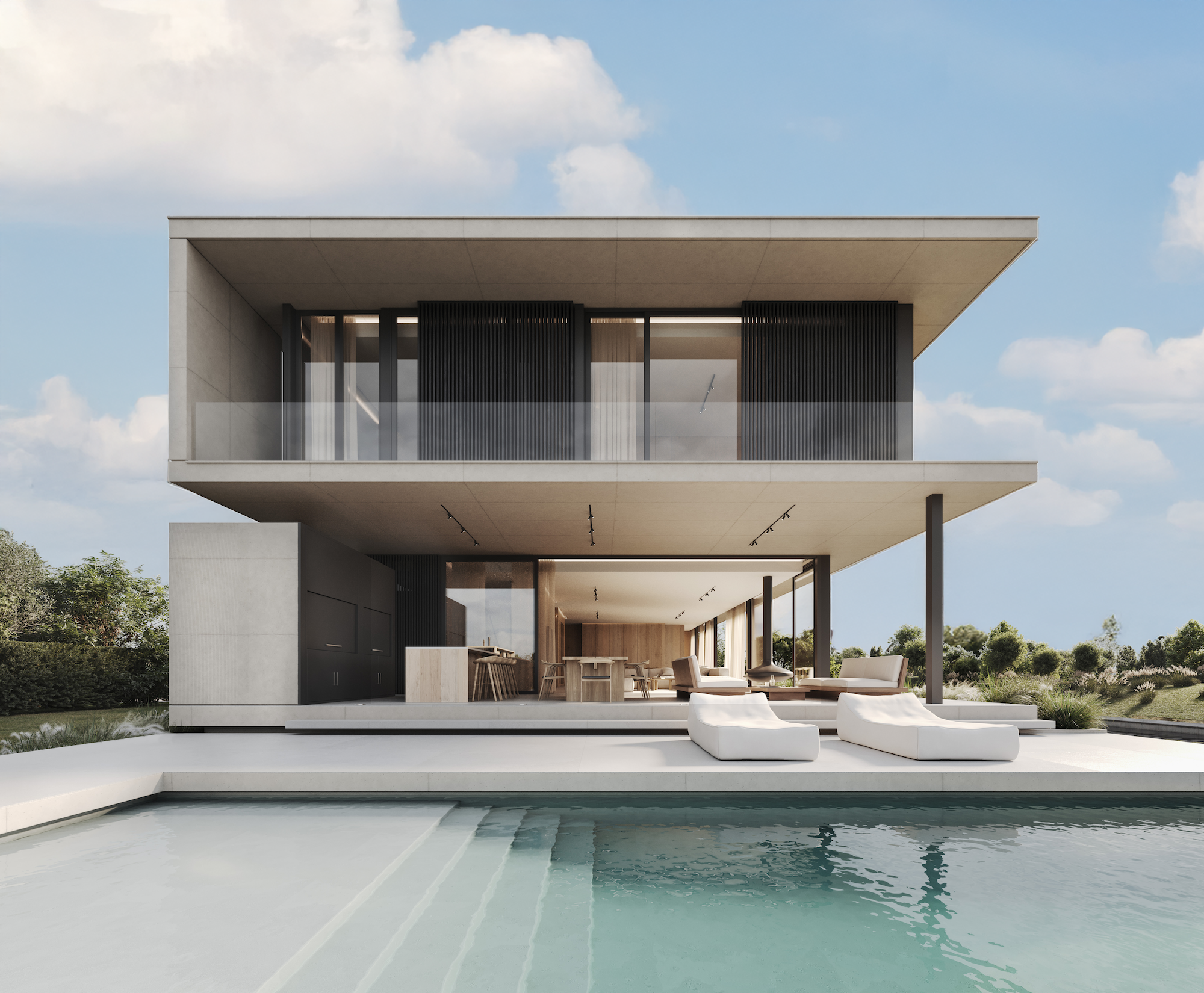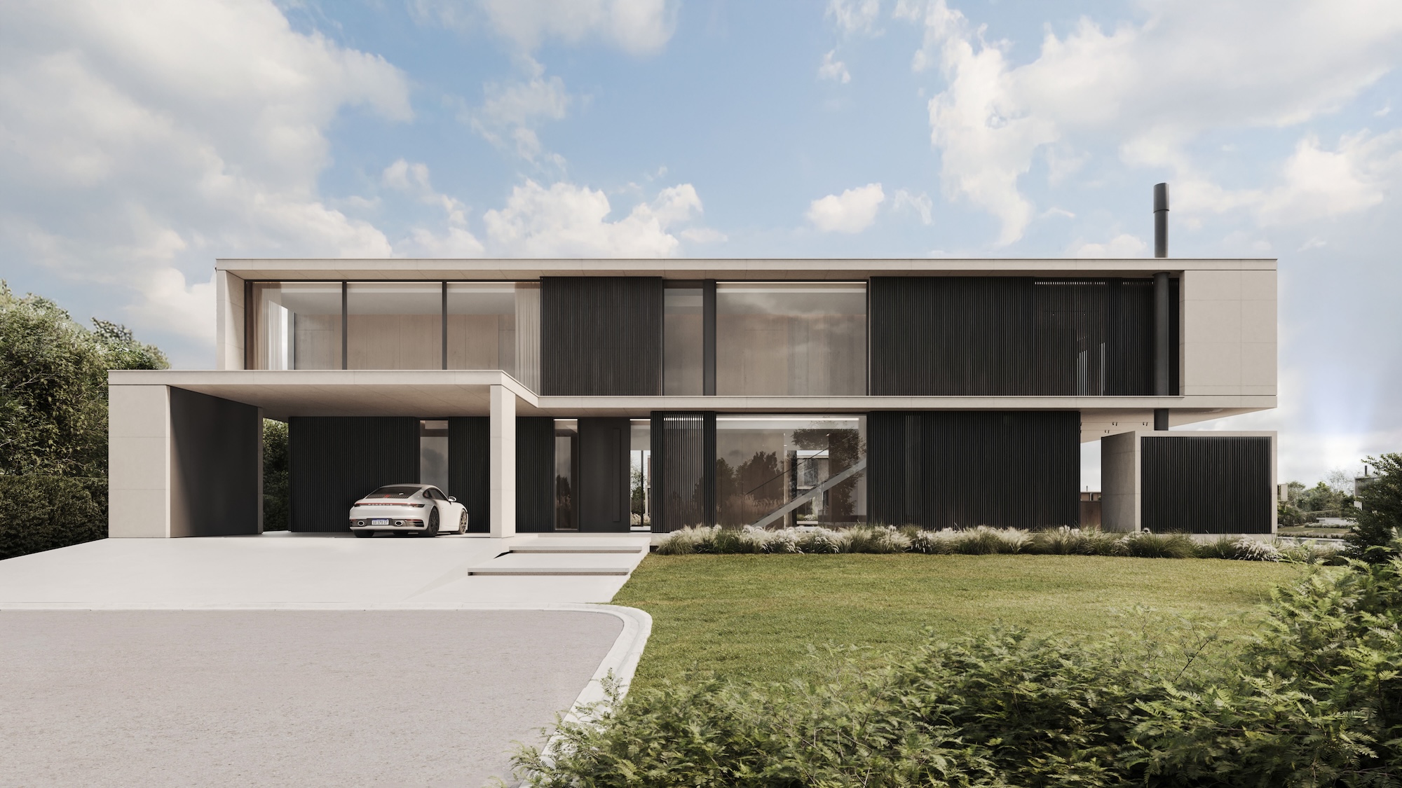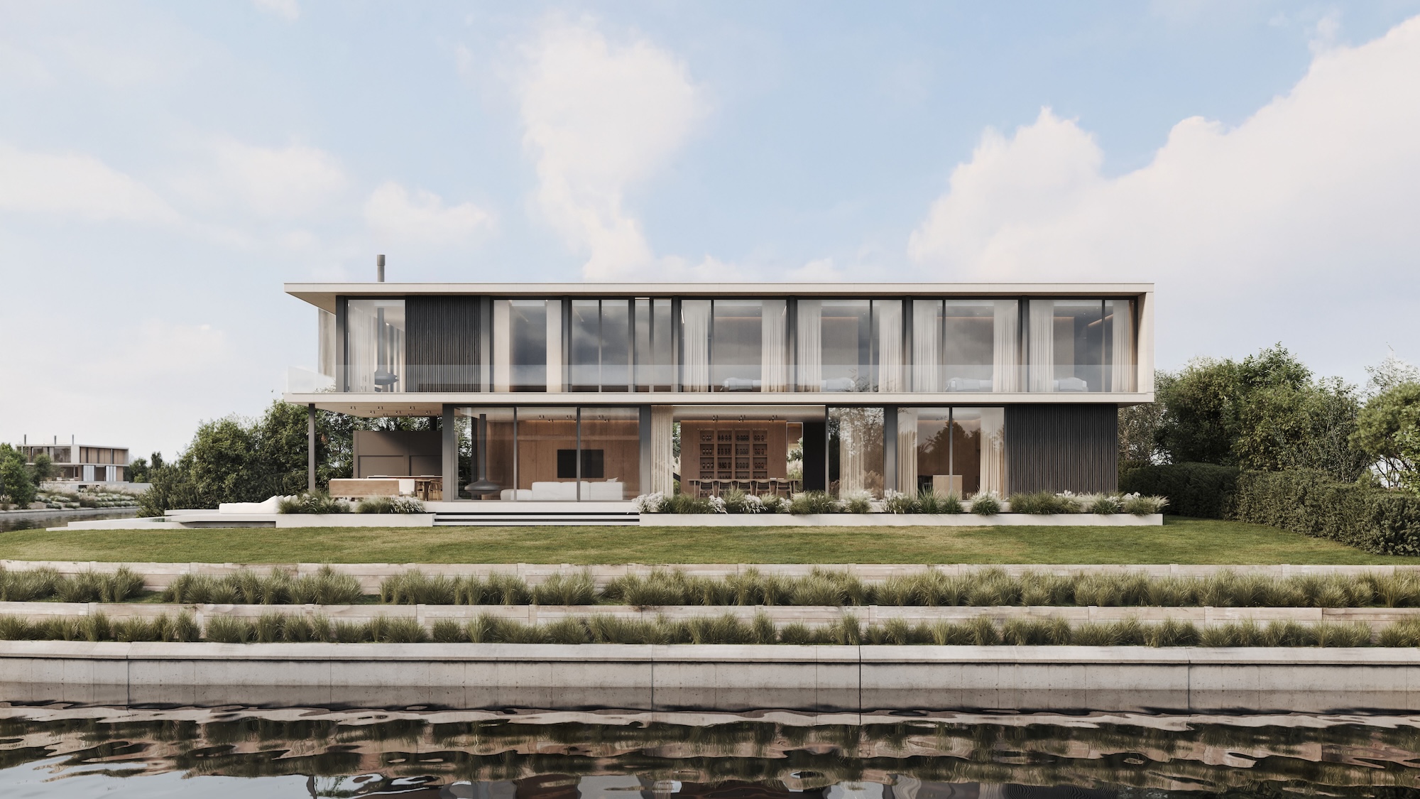Situada en un terreno en esquina frente a un canal, esta casa de dos plantas está diseñada para maximizar las vistas y la conexión con el entorno acuático. Su estética contemporánea combina el hormigón visto con un revestimiento de varillas negras, que aportan textura y personalidad al conjunto.