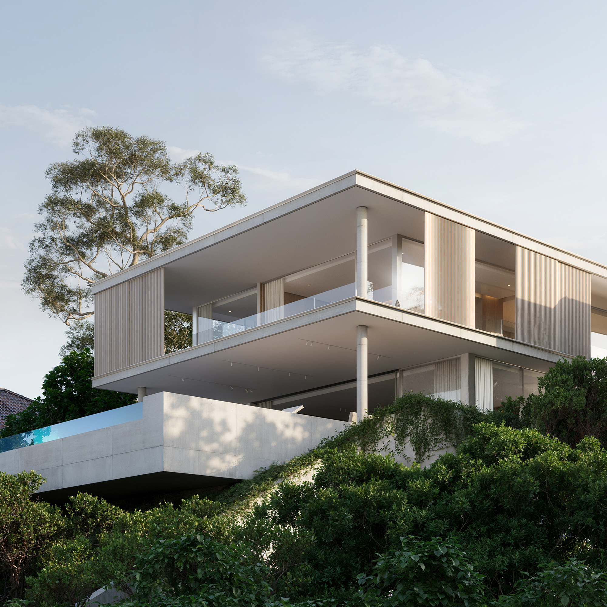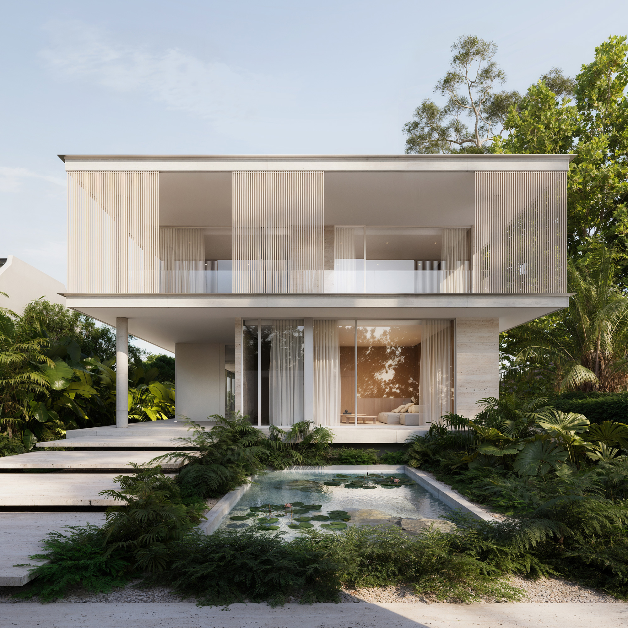 La materialidad se define por una paleta sobria y atemporal, donde predominan los tonos claros, el hormigón, la madera y el vidrio, generando una arquitectura cálida y elegante. La estructura de losas planas y columnas esbeltas permite plantas libres y La vivienda se implanta en un entorno natural con fuerte presencia vegetal, buscando una integración directa entre arquitectura y paisaje. El proyecto se concibe a partir de planos horizontales superpuestos que definen una volumetría clara y contemporánea, priorizando las visuales, la luz natural y la relación interior–exterior.
