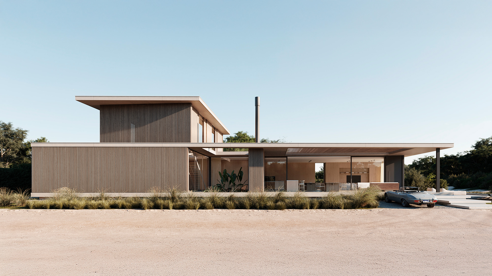 El lenguaje arquitectónico sobrio y preciso caracteriza a esta vivienda de playa, donde el hormigón visto y la madera se combinan con una estructura de líneas puras y techos planos. La composición volumétrica articula los distintos espacios de forma clara, destacándose una galería que funciona como ingreso principal y organiza el recorrido hacia las diferentes áreas de la casa. El solárium se ubica en uno de los laterales, generando una relación directa con el entorno natural y ofreciendo un espacio de relajación al aire libre.