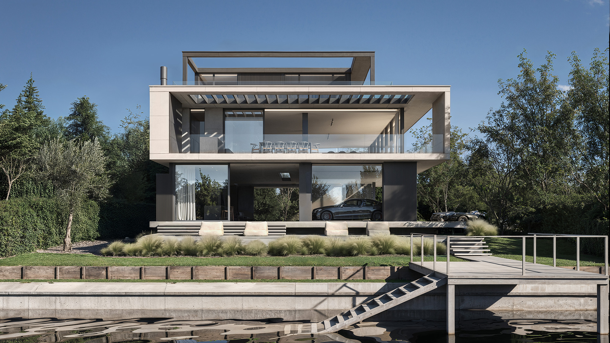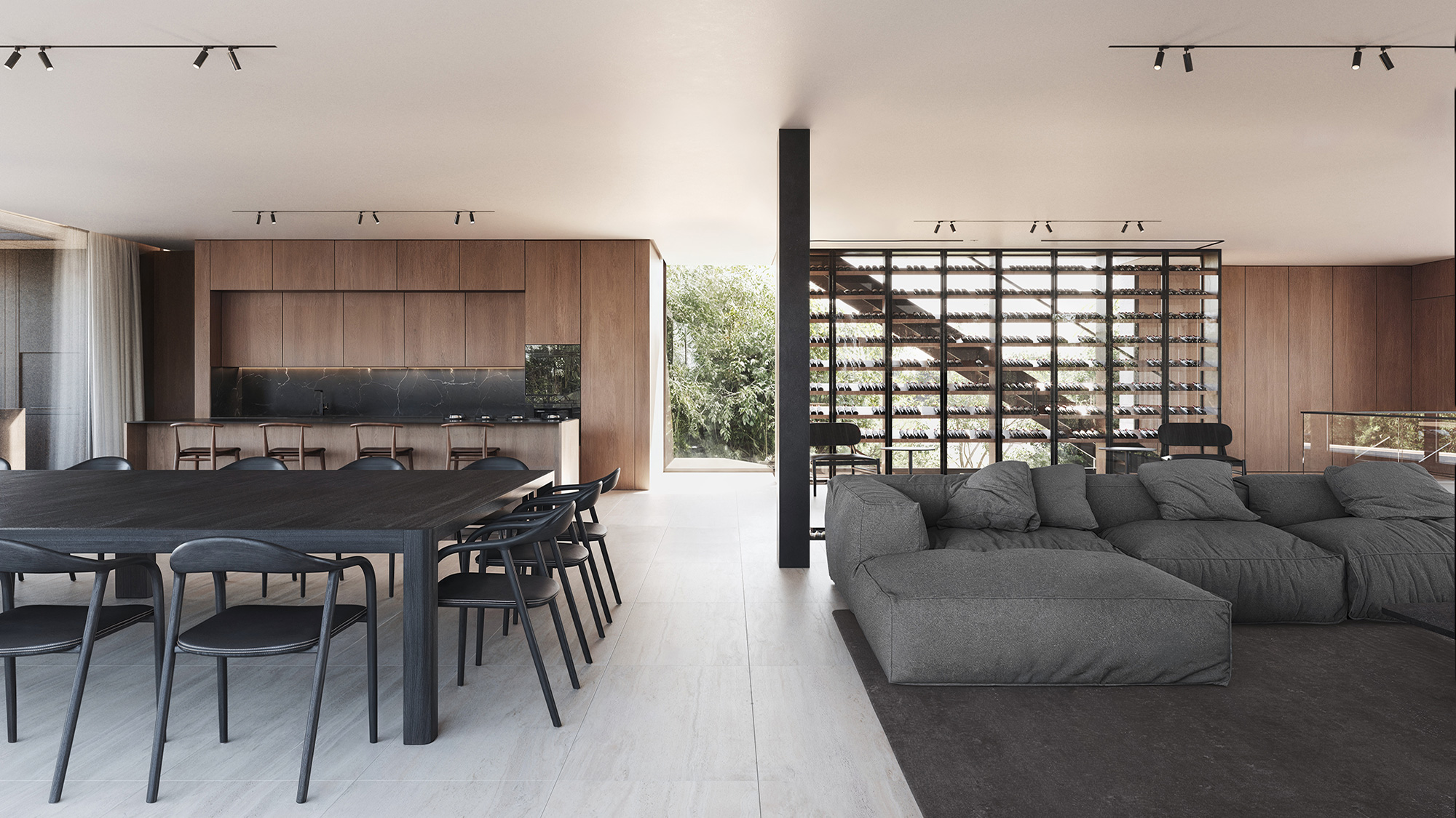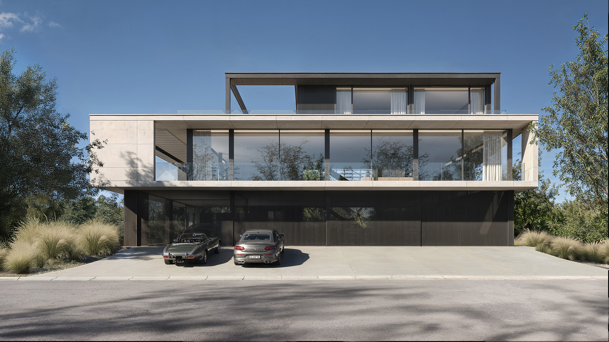 Los espacios sociales se abren completamente hacia el exterior, favoreciendo la continuidad entre interior y paisaje y potenciando la vida al aire libre, mientras que las áreas privadas se organizan en los niveles superiores, protegidas por aleros y sistemas de control solar que aseguran confort y privacidad. La materialidad, sobria y cuidadosamente seleccionada, basada en hormigón, vidrio y madera, construye una imagen atemporal y equilibrada, donde la arquitectura se integra al paisaje con serenidad y naturalidad.